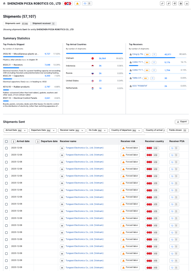 Peering into Shenzhen PICEA Robotics’ latest supply chain. By the way, it has links to companies with “forced labor” risks. This data was generated by the supply chain risk analysis company Sayari.