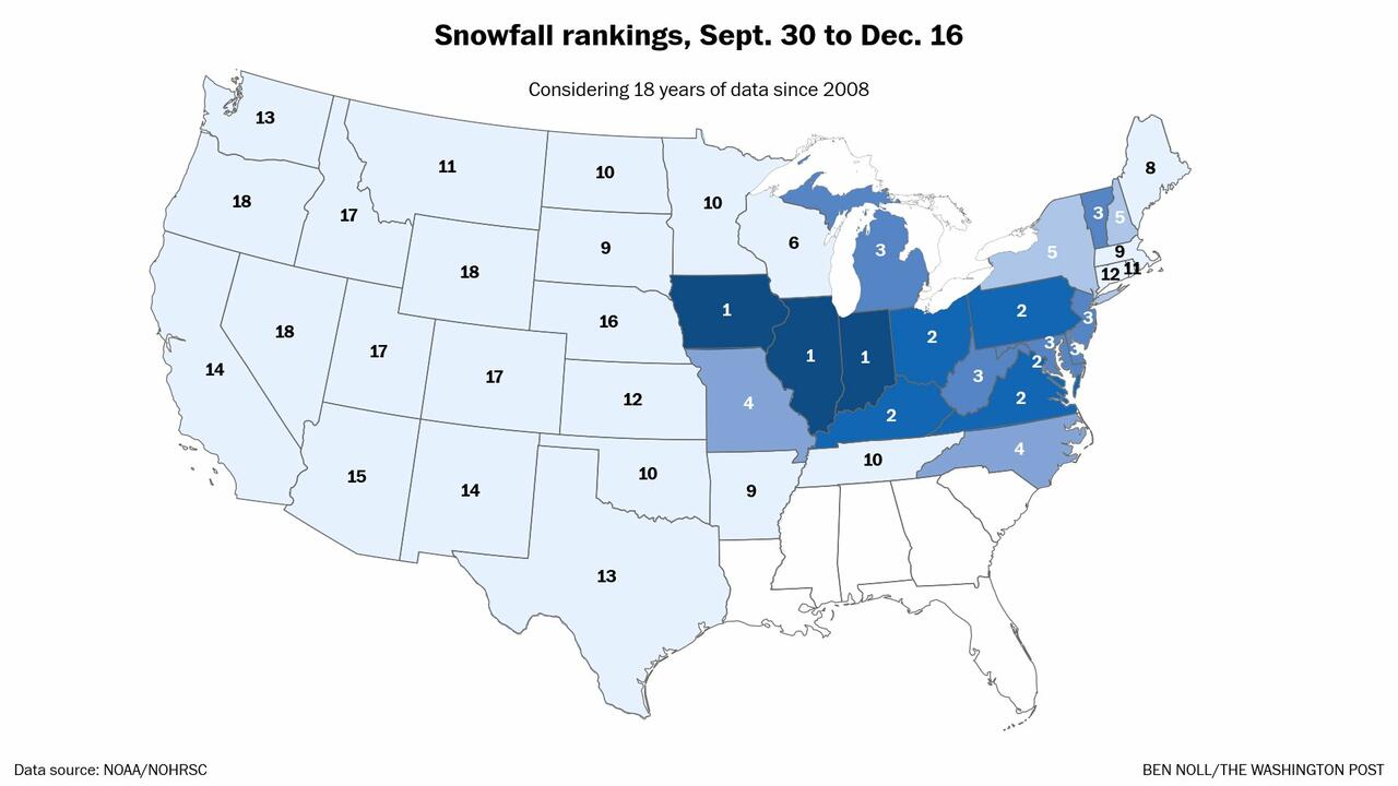 Noll noted, “States such as Iowa, Illinois, and Indiana experienced their snowiest start to the season since at least 2008. Michigan, Ohio, Kentucky, Pennsylvania, West Virginia, Virginia, Maryland, Delaware, D.C., New Jersey, and Vermont rank in the top three snowiest over that same period.”