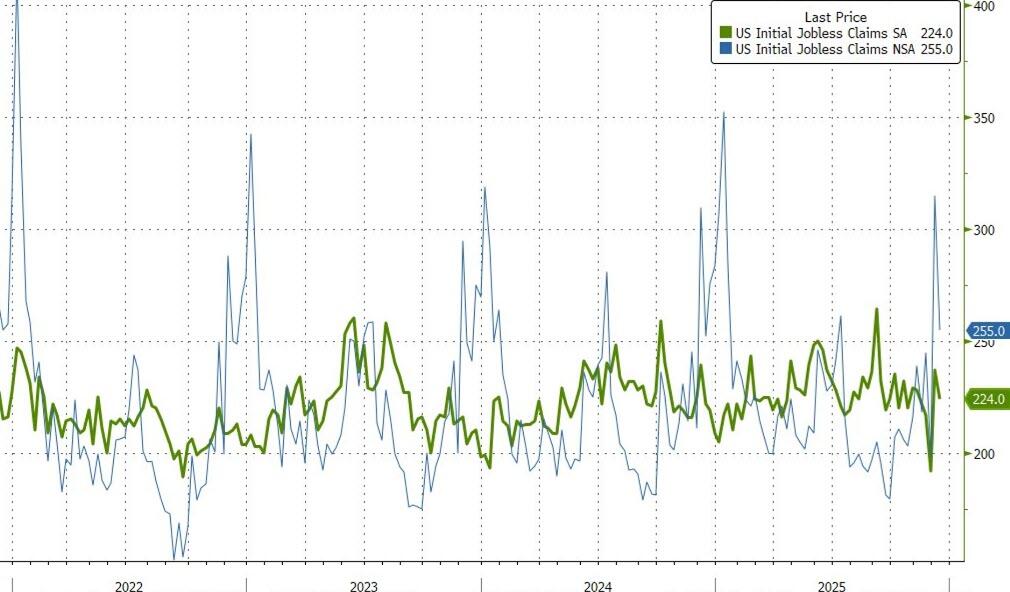 After the Thanksgiving Week debacle, the number of Americans filing for jobless benefits for the first time remains back in the same – very low – range it has been in for the last four years at 224k…