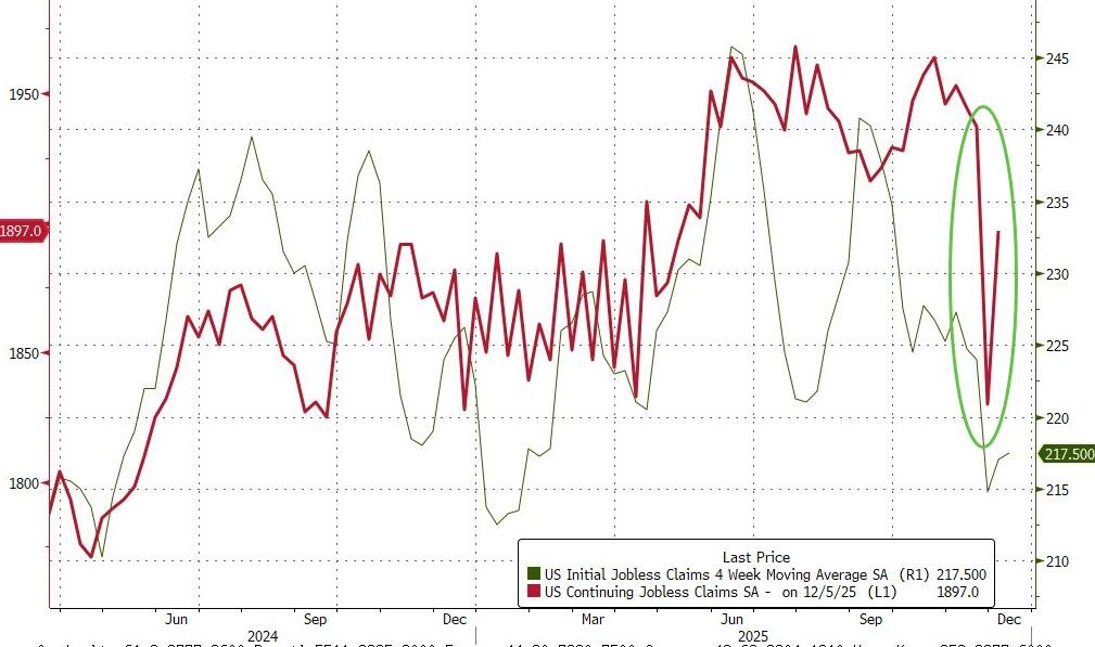 Continuing jobless claims bounced back a little from the big Thanksgiving week plunge but remain well off recent highs…