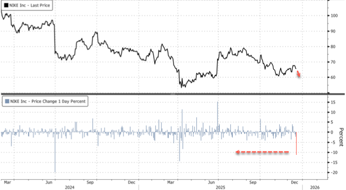 In markets, Nike shares fell sharply, down about 11% in premarket trading in New York. If those losses carry into the cash session and the stock closes near the lows, it would mark the worst decline since early April. Year to date, shares are down 13.3% as of Thursday’s close. The last time the stock traded in the low $60s was during the Covid crash.