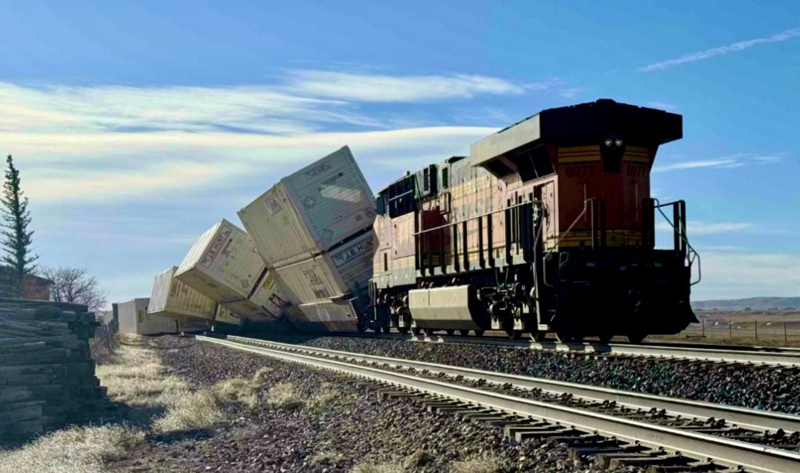 Wyoming-based media outlet Cowboy State Daily reported that a BNSF Railway train carrying dozens of double-stacked freight cars derailed early Friday morning northwest of Cheyenne due to extreme winds exceeding 144 mph.