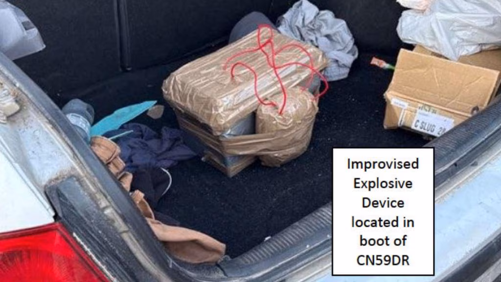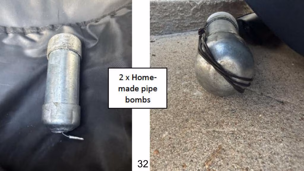 “Preliminary analysis indicates the pipe bombs were made of sealed aluminium piping containing explosive, black powder and steel ball bearings. The pipe bombs did not detonate; however, preliminary analysis indicates both items were assessed as viable improvised explosive devices.”