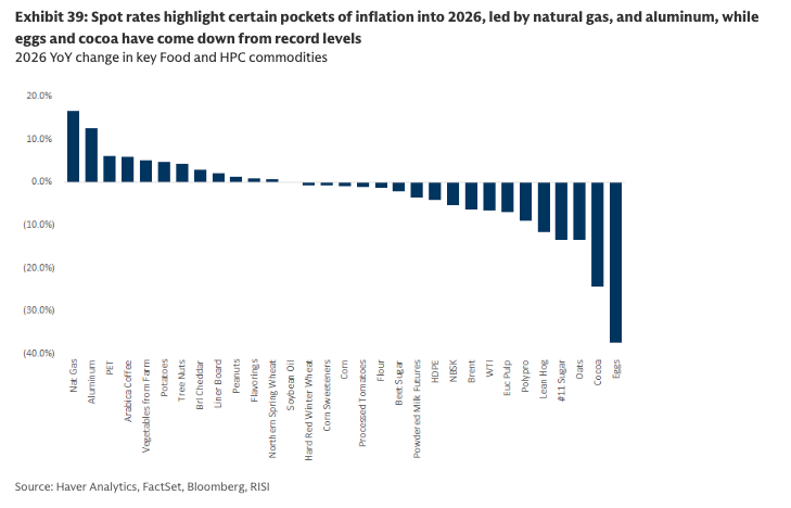 Pockets of easing commodity pressure to aid earnings growth for some. While input cost inflation has meaningfully moderated for Staples at large over the past couple of years, certain pockets (e.g., cocoa, proteins) were still inflationary and weighed on earnings. As prices continue to come down meaningfully from peak levels, we would expect benefits from an easing cost environment to aid earnings growth. However, spot rates suggest aluminum will likely see the highest inflation in 2026. Moreover, oil/natural gas prices remain volatile owing to ongoing geopolitical tensions, which, along with pressure from tariffs, could further limit the extent of gross margin expansion ahead. Ultimately, we believe the input cost environment will be much more accommodative for our Staples universe next year, which along with an increased focus on productivity (as supply chains and service levels have normalized), should support continued margin expansion and reinvestments ahead. We highlight HSY as best placed to benefit from this dynamic, where we expect gross margin expansion to drive EPS growth in 2026. We also highlight potential tailwinds for MDLZ, HRL, and SFD.
