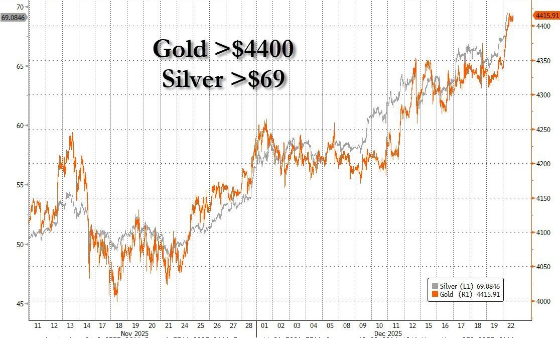 A year-end rally in stocks is taking hold, with investors positive about further gains in 2026, although volumes are set to be thinner in this holiday-shortened trading week. Sentiment has been bullish for three weeks in a row, according to Deutsche Bank strategists. Meanwhile, in commodities, oil rose as Trump intensified a blockade on Venezuela. Gold and silver soared to all-time highs on the escalating geopolitical tensions and bets on Fed rate cuts.