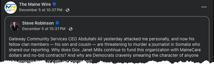 Gateway Community Services CEO Abdullahi Ali yesterday attacked me personally, and now his fellow clan members — his son and cousin — are threatening to murder a journalist in Somalia who shared our reporting. Why does Gov. Janet Mills continue to fund this organization with MaineCare dollars and no-bid contracts? And why are Democrats cravenly smearing the character of anyone who exposes fraud or calls out corruption?