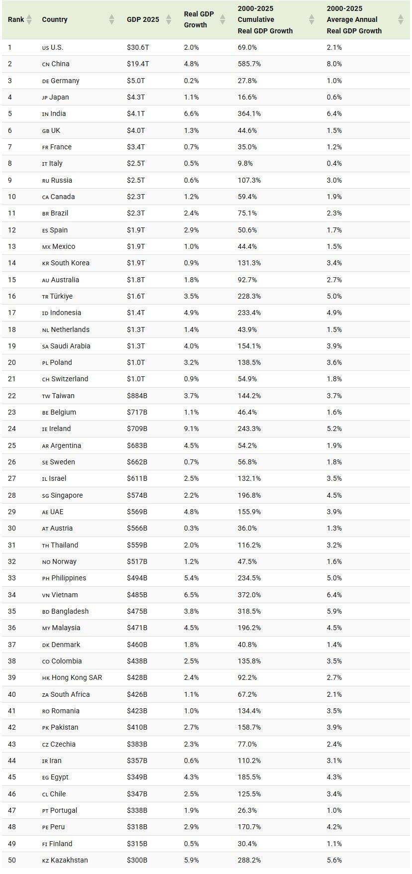 Below, we rank the 50 largest economies globally, highlighting their historical growth trends:
