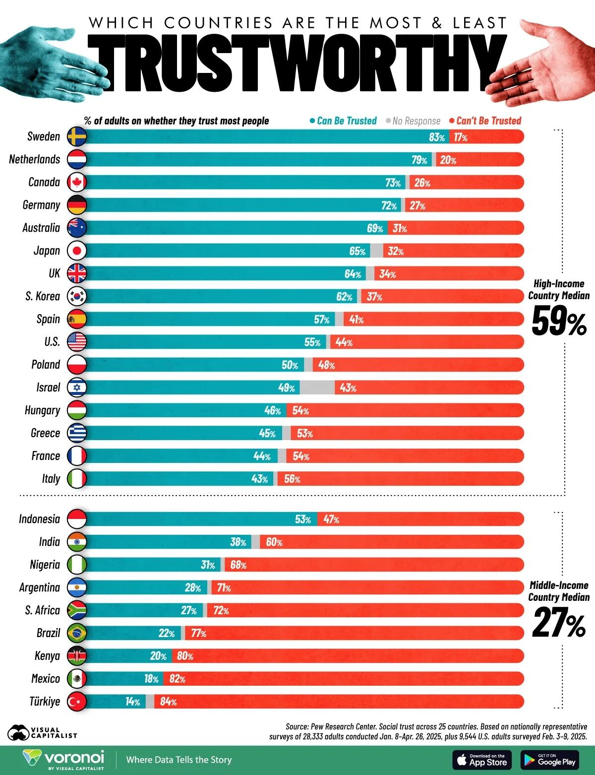 In these countries, respondents are far more likely to say that most people cannot be trusted. Pew notes that lower income levels and less access to education are closely linked to reduced trust. Economic insecurity and weaker institutions may make people more guarded in their interactions.