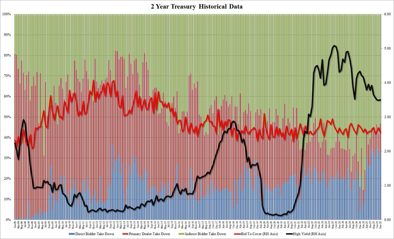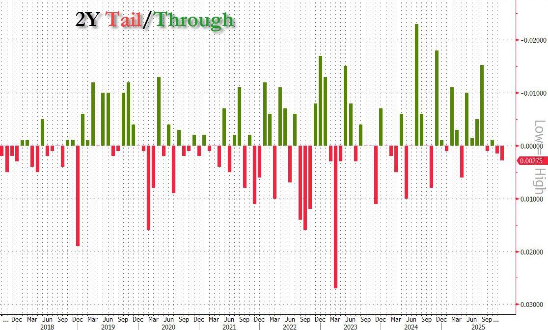 The auction of $69BN in 2Y paper stopped at a high yield of 3.499%, up 1bp from last month’s 3.489%, and tailed the When Issued by 0.3bps, the biggest tail for the short-end since April’s 0.6bps tail. It followed a series of what had been mostly stopping through auctions throughout 2025.