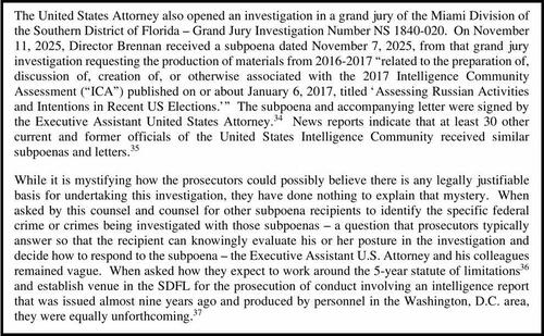 The word “target” is important here, because the letter specifically outlines how Brennan has received subpoenas for documents and information surrounding his construct of the 2017 Intelligence Community Assessment.
