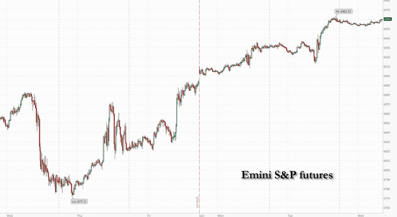 And there it is: the Santa Rally which we predicted would begin a week ago after Abu Dhabi removed much of the AI capex fears festering the OpenAI ecosystem, the S&P has rocketed to a new record high on Tuesday, with stocks looking set for a quiet start to the abbreviated Christmas Eve session. As of 8:00am ET, S&P 500 futures and Nasdaq 100 contracts were little changed following four days of gains in US stocks which signal confidence among investors that 2026 will bring decent corporate earnings growth and easing inflation, not to mention the restart of the Fed’s QE Lite which has so far injected $40bn into the market. The result is relative calm in equities, with no down month since April and a VIX which is below 14. In premarket trading, Nike gained 2.1% after a filing shows that Apple CEO Tim Cook purchased $2.95 million worth of shares. Intel shares fall as much as 3.1% in premarket trading after Reuters reported that Nvidia halted a test that uses the chip manufacturer’s 18A technology to produce its chips, while a Commerce Department official said Intel is not “too strategic to fail.” Wednesday’s shortened cash trading session finishes at 1 p.m. ET. Most of the drama is playing out in commodities, with gold, silver and platinum all hitting fresh record highs. On today’s economic calendar we have the latest MBA Mortgage Applications (-5.0%) and the weekly Initial and continuing jobless claims.