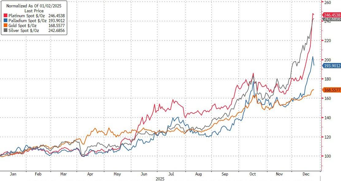 In commodities action, precious metals hit more record highs, buoyed by geopolitical concerns and expectations for more interest-rate cuts in 2026. Gold touches $4,500 an ounce for the first time, while silver and platinum also surge to all-time highs. The moves put gold and silver on track for their best yearly gains since 1979. Copper is also at a new record around $12,200 a ton, and is set for its biggest annual rise since 2009