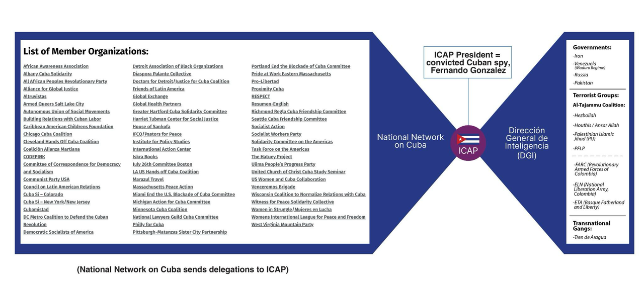 Funding and infrastructure come from the Neville Roy Singham Network, a web of organizations tied to Chinese Communist Party-aligned capital that provides money, logistics, and professionalized organizing capacity. Public narratives are amplified by legacy anti-war organizations like CODEPINK and the ANSWER Coalition, which are also now under the Singham umbrella. They frame U.S. foreign policy as illegitimate while defending authoritarian adversaries. The Democratic Socialists of America (DSA) functions as the political activation channel, translating activist energy into electoral and legislative influence on behalf of the Cuban regime.