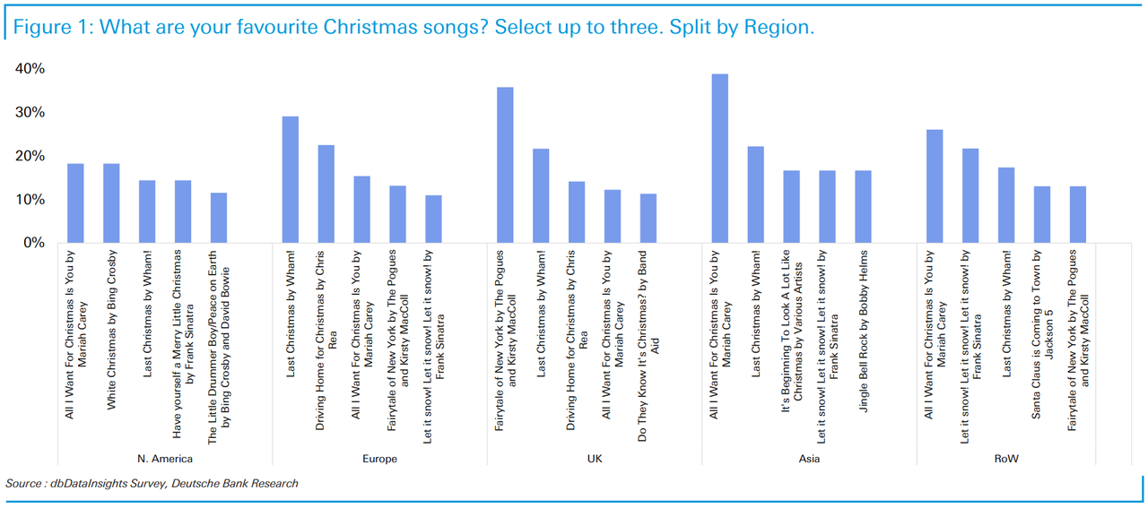 At a global level, the bank’s 2026 Year Ahead Global Markets Survey found that Wham! won again, while regionally, Mariah Carey took the crown in the US, Asia, and the Rest of the World with All I Want For Christmas is You. The full list is in the report.