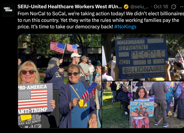S.E.I.U.-U.H.W. joined a “No Kings” rally against Trump earlier this year. What the union does not want you to know is that the rally was funded by dark-money NGOs tied to leftist billionaires. It was merely a propaganda scam from the start. In reality, the union functions as little more than a megaphone for the Democratic Party’s unhinged left-wing billionaire class that openly hates America and capitalism.