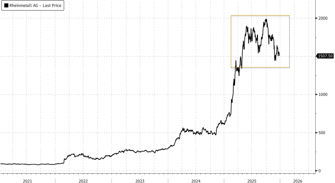 Even as a potential peace deal in Eastern Europe nears, we expect defense stocks to remain elevated given record defense spending.