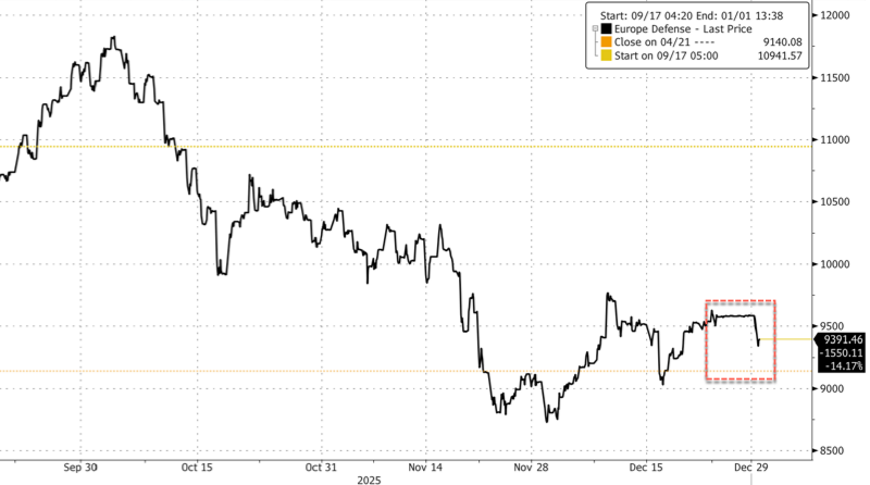 The Goldman Sachs European Defense Index fell by roughly 2% on Monday following overnight developments.