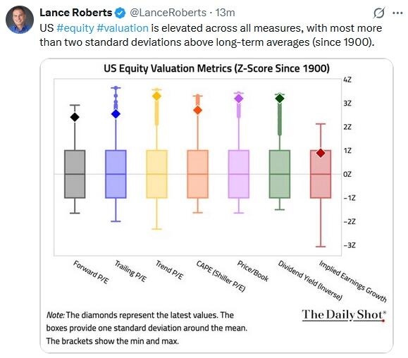 That last sentence is the most crucial. With valuations near cycle highs, (the S&P 500 trades at over 22x times forward earnings, which is well above its long-term average), such assume strong earnings growth and low discount rates. Yet both assumptions are vulnerable. If economic growth undershoots, earnings revisions will follow. Historically, earnings have tended to lag behind the economic cycle. As consumption softens, revenue growth stalls. Margins then compress, especially for companies with high labor or financing costs, and with narrow market breadth and concentration in mega-cap names, the market risk is a sudden repricing of those expectations.