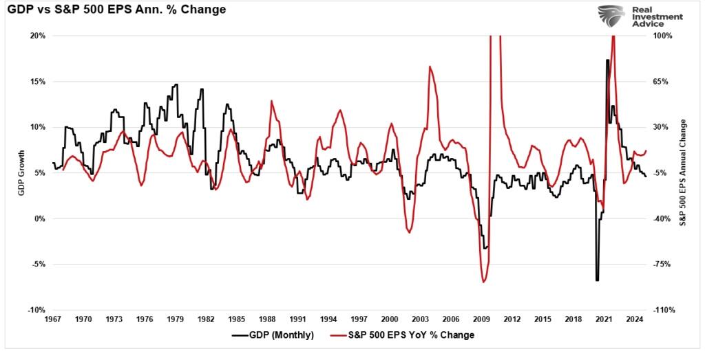 Furthermore, economic growth relies heavily on consumer spending, which accounts for nearly 70% of U.S. GDP. For that consumption to persist or grow, consumers must have rising incomes, which come from employment and wage growth. Without job creation or real wage increases, consumption growth stagnates, and the earnings narrative breaks down. As shown, when economic growth declines, so do earnings growth rates.