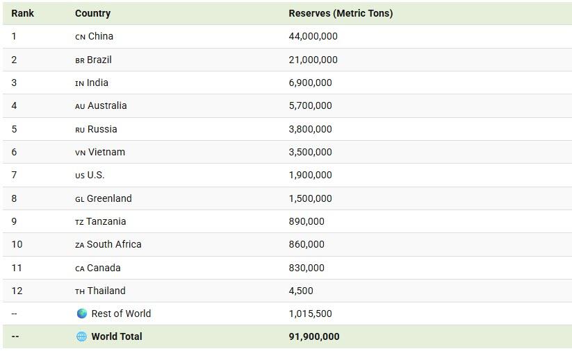 India (6.9 million tons) and Australia (5.7 million tons) round out the top tier, while Russia (3.8 million tons) and Vietnam (3.5 million tons) are also ahead of the United States. Together, the top six countries account for roughly four-fifths of known reserves.