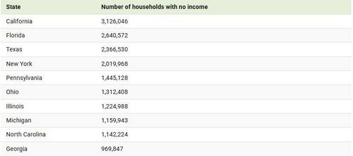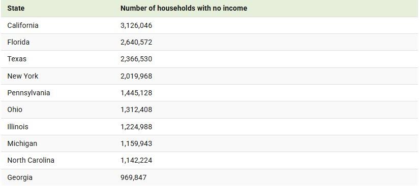 Beyond California, Texas, Florida, and New York, states like Ohio and Michigan also rank in the top 10, despite sitting closer to the middle of the pack by share of no-income households. Their high totals reflect population scale rather than unusually high prevalence.