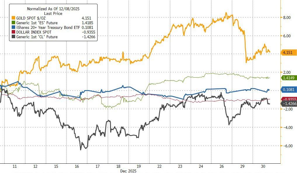 Since the last FOMC meeting on Dec 10th (which resulted in a more-dovish-than-expected 25bps rate cut along with 3 dissents), precious metals have been the biggest gainers (as the dollar weakened) while crude oil has been a laggard. Stocks small bid, bonds unch…