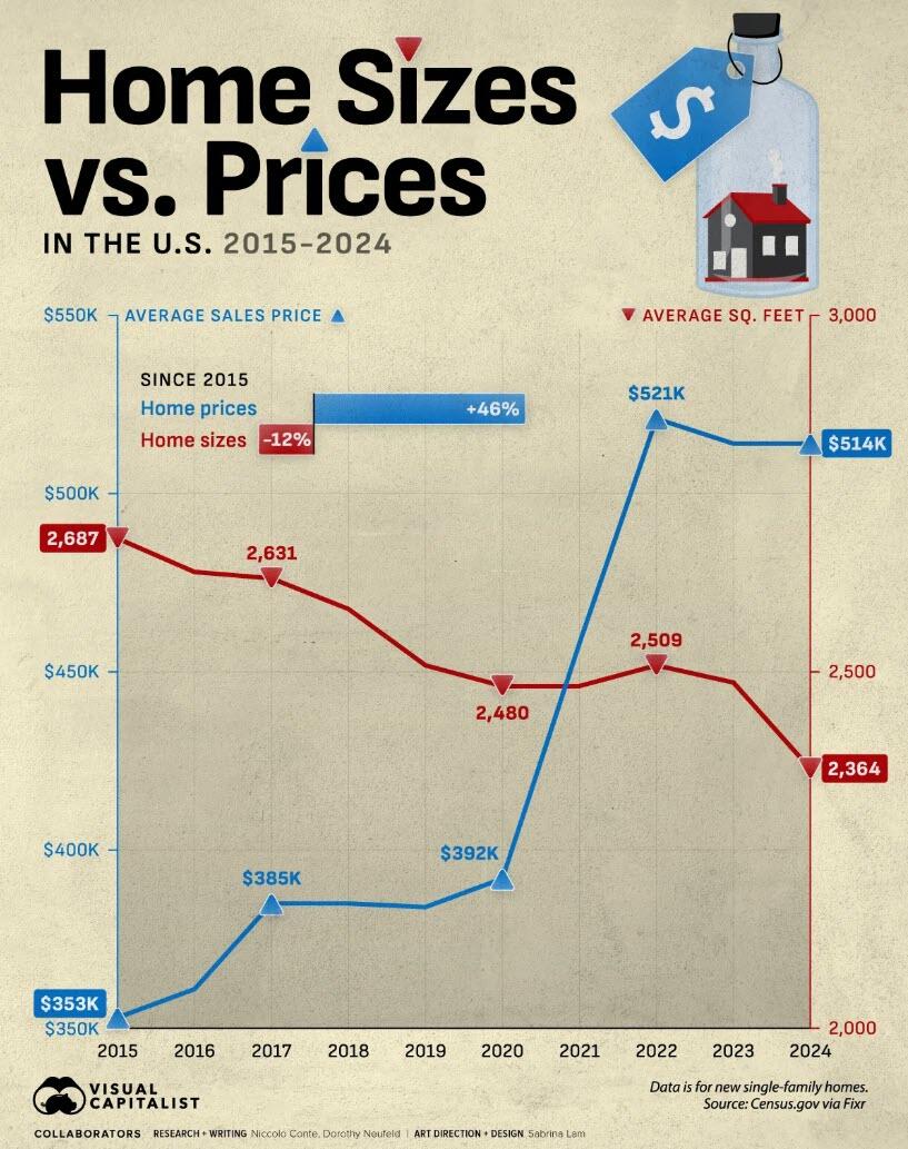 This graphic, via Visual Capitalist’s Dorothy Neufeld, shows the typical size versus the average cost of a new home since 2015, based on data from the U.S. Census Bureau via Fixr.