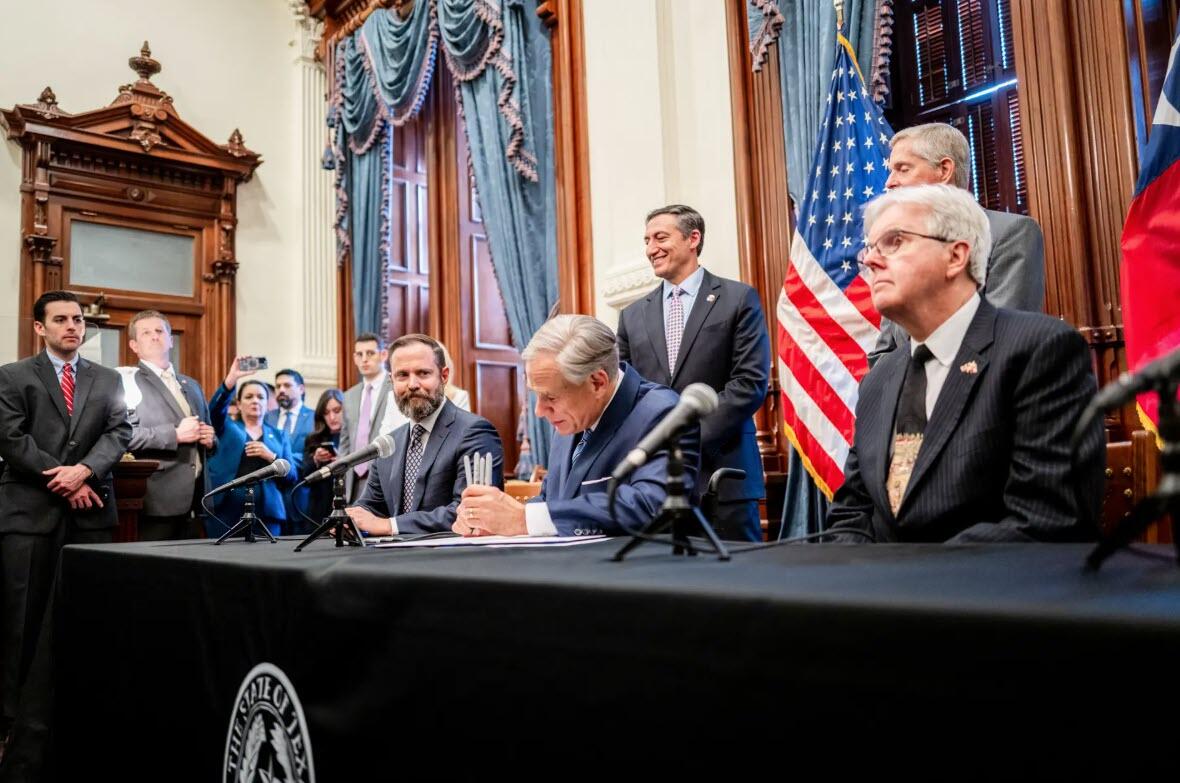 Texas Gov. Greg Abbott signs a bill at the state Capitol in Austin on April 23, 2025. Earlier this year, Abbott signed measures that would curb exclusionary residential compounds—citing the EPIC project—and restrict land purchases by foreign adversaries and transnational criminal groups. Brandon Bell/Getty Images