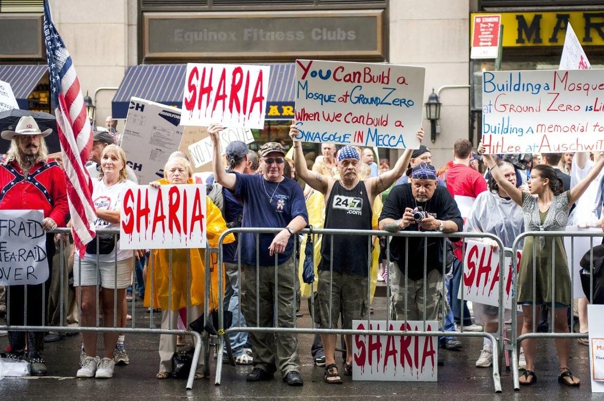 Demonstrators attend a rally with the Coalition to Honor Ground Zero in New York City on Aug. 22, 2010. The rally was held to oppose the construction of an Islamic Center and mosque near Ground Zero. Don Emmert/AFP via Getty Images