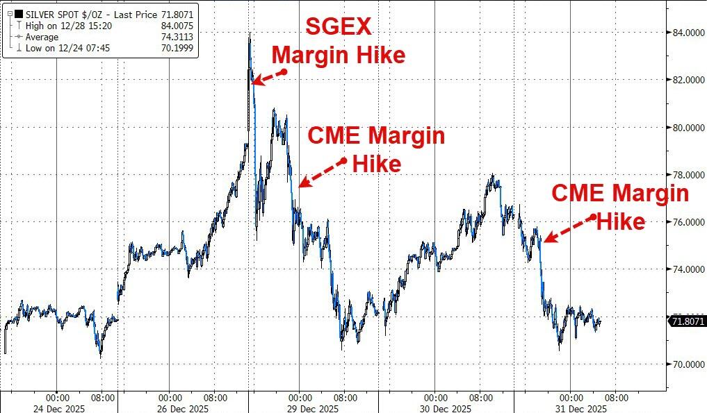 That ‘volatility struck over the weekend with Monday’s big price retreat:  silver prices did take a significant downward presumably because of another increase in margin levels at the CME during a very illiquid time of year, and positions being adjusted, with initial margins jumping $3,000/oz from $22,000/oz to $25,000/oz.  This followed an increase on Dec 12th, 2025, with a 10% increase in margins to the $22,000/oz level.