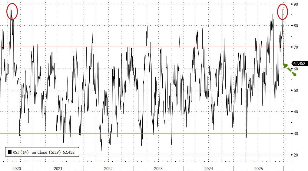 While there has been much talk of Silver being in a bubble, SocGen explained here why they disagree with the ‘models’, and we now note that silver no longer officially ‘overbought’…