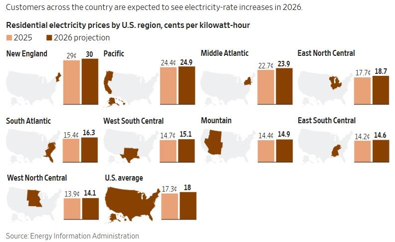According to the Wall Street Journal, electricity prices have risen meaningfully across much of the country since 2022, and the drivers extend well beyond the frequently cited surge in data-center demand.