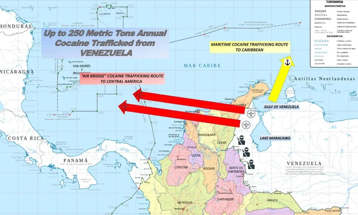 Justice Department officials alleged that Venezuelan President Nicolas Maduro and other regime officials ran a cartel aimed at flooding the United States with cocaine. The United States estimates that 250 metric tons of cocaine are trafficked from Venezuela each year. Department of Justice