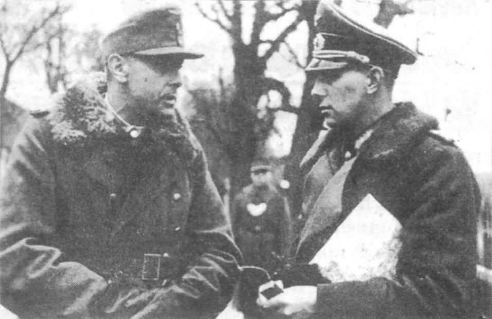 Major General Remer, right, commander of the “Panzer Führer-Begleitdivision,” talks with Major General Maeder during the battle near Lauban (lower Silesia) in March 1945.