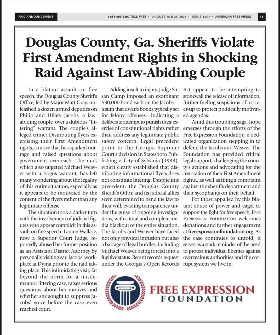 Many of you will remember this atrocious violation of free speech in Douglas County, Georgia when nearly a dozen armed sheriffs deputies threw a raid on a law-abiding couple for trumped up littering charges. You can refresh your memories with the first two articles linked below: