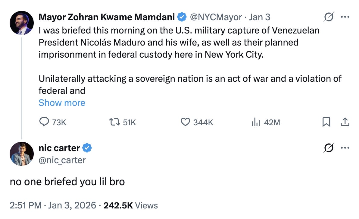 The mayor of New York City has no role in U.S. military operations, no authority over foreign policy, and no access to classified information, yet Mamdani spoke as though he were taking notes in the Situation Room. The internet responded the only way it could: with laughter.