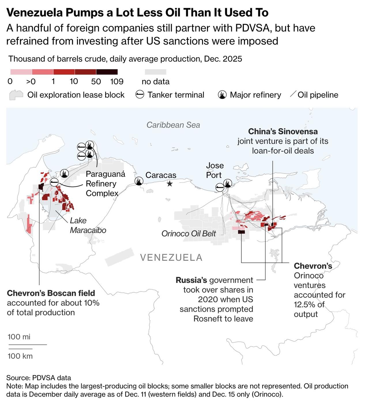Bloomberg writes that Trump, however, left the meeting projecting momentum. “We sort of formed a deal,” he told reporters, predicting companies would soon be investing “hundreds of billions of dollars in drilling oil.” Yet when pressed for specifics, Energy Secretary Chris Wright acknowledged that Chevron — the only U.S. major still operating in Venezuela — was the only firm to make a concrete pledge. Chevron Vice Chairman Mark Nelson said production, now about 240,000 barrels per day, could rise by roughly 50% within 18 to 24 months.
