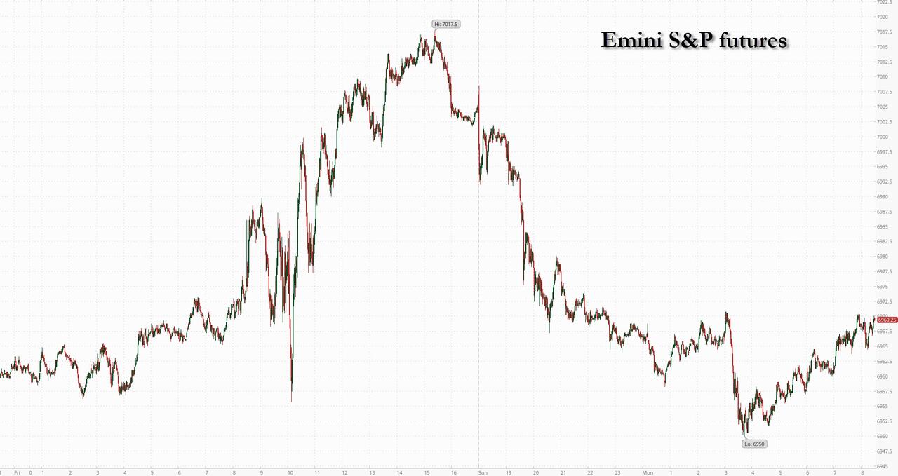 “Sell America” is back: US equity futures and other US assets – including the dollar – are lower (even as Europe and Asia rise) while precious metals surge to new record highs after the DOJ subpoenaed the Fed and launched a criminal probe into Jerome Powell; ongoing protests in Iran are also denting sentiment. As of 8:15am, S&P 500 contracts are lower by 0.5%, Nasdaq down 0.7%. In premarket trading, credit card stocks are down following President Trump’s late Friday remarks on rate caps. The attack on the Fed has been felt on the US yield curve, with 10- and 30-year yields higher by 3bps and 4bps, respectively. The dollar is down versus most major currencies – Bloomberg Dollar Index lower by 0.3%. Swiss franc outperforms on haven appeal, yen unable to benefit amid the prospect for Japanese elections. Precious metals hit further record highs; gold up 1.7%, silver higher by over 5%; the former stalled ahead of $4,600/oz. Brent crude faded upside triggered by supply concerns from Iran, lower by 0.8%. Bitcoin down 0.2%.