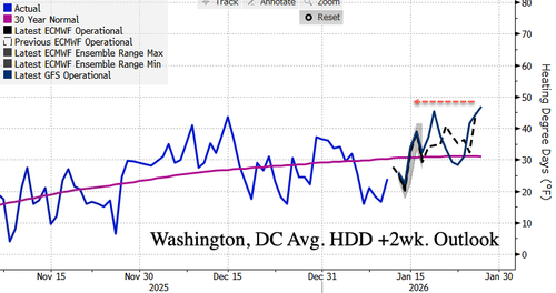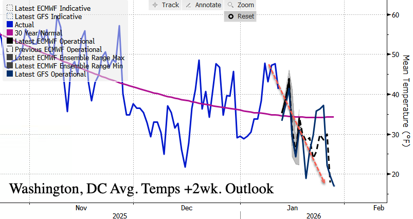 The Arctic blast is expected to be severe. Bloomberg data indicate that average forecast temperatures for Washington, D.C., over the next two weeks will run well below 30-year norms, with end-of-month readings dipping into the high teens.