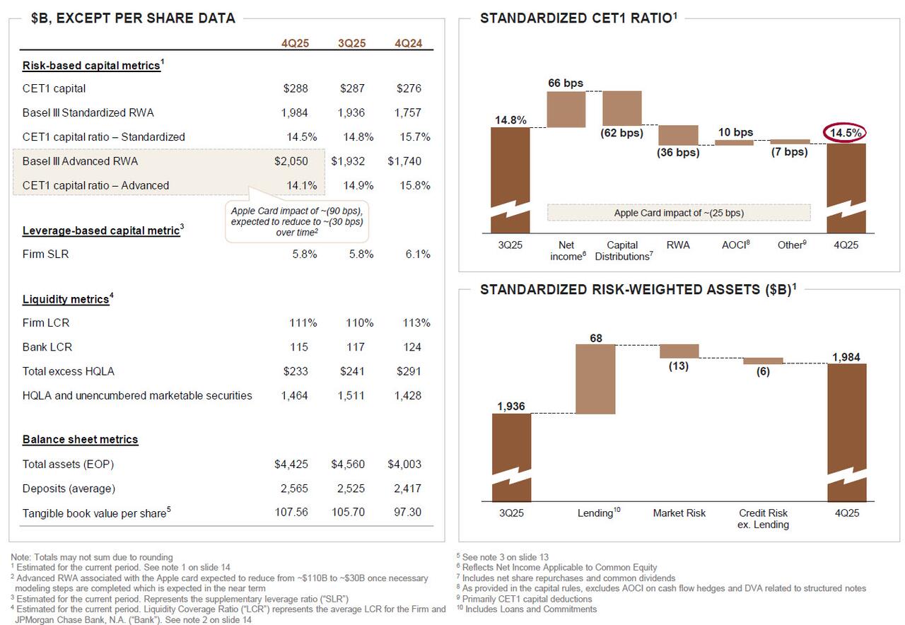 “The U.S. economy has remained resilient,” said CEO Jamie Dimon adding that “while labor markets have softened, conditions do not appear to be worsening. Meanwhile, consumers continue to spend, and businesses generally remain healthy.” Dimon said those conditions “could persist for some time, particularly with ongoing fiscal stimulus, the benefits of deregulation and the Fed’s recent monetary policy. However, as usual, we remain vigilant, and markets seem to underappreciate the potential hazards—including from complex geopolitical conditions, the risk of sticky inflation and elevated asset prices.”