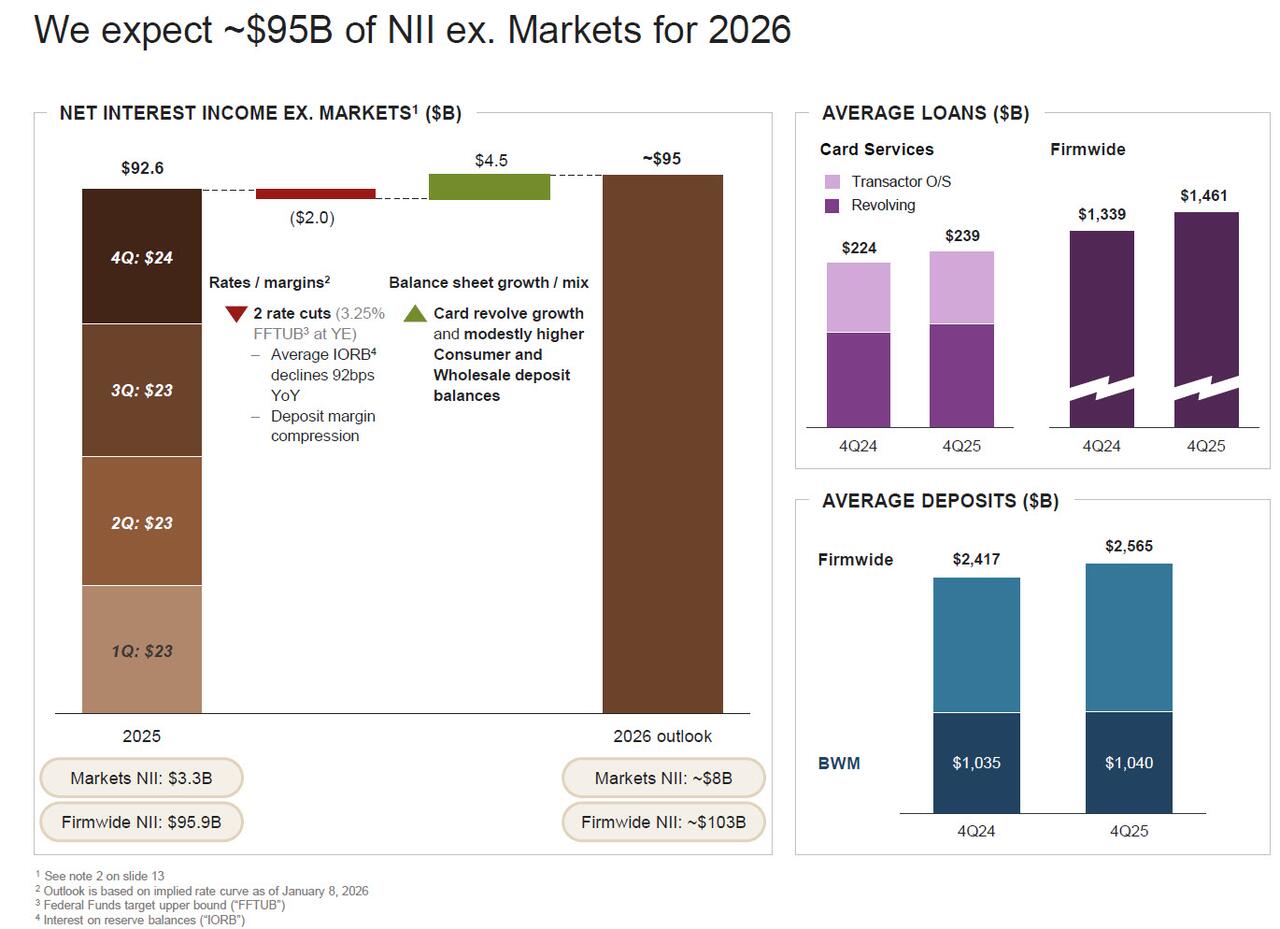 JPMorgan’s loans climbed 4% in the last three months of the year from the previous quarter. NII climbed 7% from a year earlier. The bank said in a presentation Tuesday that it expects to earn about $103 billion in NII in 2026.