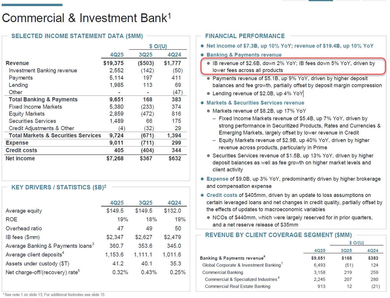 - IB revenue of $2.6B, down 2% YoY; IB fees down 5% YoY, driven by lower fees across all products