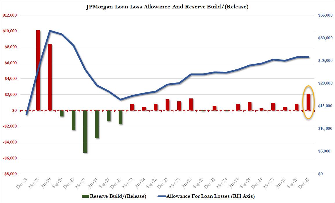 Especially notable is that in Q4, JPM’s reserve build soared to $2.1BN, highest since Covid, reflecting $2.2BN reserve established for forward purchase commitment of Apple credit card business, which must have been an epic disaster under Goldman. Combined with $2.51BN in charge offs (which was below estimates of $2.56BN), this meant that total credit costs were a whopping $4.7 billion, also highest since covid.