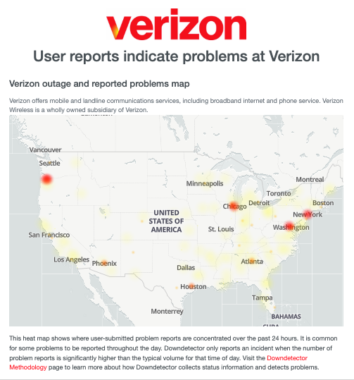 At a more granular level of the Verizon outage, reports indicate that outages and disruptions are being logged across the Washington-Baltimore region, New York, Chicago, Atlanta, Houston, and areas near Seattle.