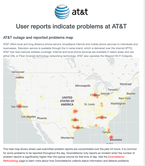 Reports of AT&T outages and disruptions appear more widespread in the central US.