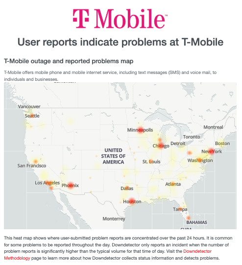 Downdetector, the website that tracks real-time outages and service disruptions across the internet, reported moments ago that users of Verizon, T-Mobile, AT&T, Verizon Fios, and U.S. Cellular are experiencing disruptions and outages that began within the last hour.