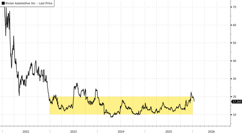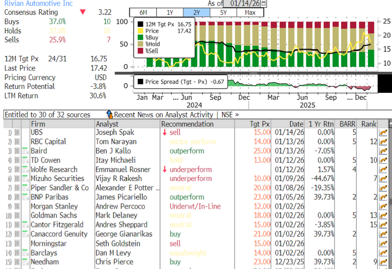 We downgrade RIVN to Sell, $15 PT seeing a less favorable risk/reward. RIVN stock has been prone to sentiment swings (often driving stock more than fundamentals) and the stock is +15% since Autonomy and AI Day on Dec. 11 (vs. S&P500 +1%) as the market assigned more enthusiasm to their AI potential. However, in our view, most of the AI related news is “out”. The other point of enthusiasm is the launch of the R2 and while we like the vehicle, expectations may be too high; our 2026/27 sales forecast is 16/19% below consensus, and current stock prices in ’27 sales ~25% above UBSe. We see ~20% downside in our base case ($15 PT) and a ~1.6x downside to upside negative skew.
