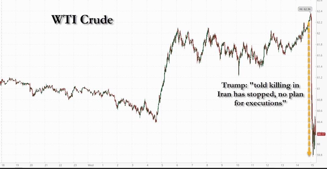 There are reports that President Trump is listening to the non-interventionists in his cabinet, as he says Thursday afternoon he’s been told that the killing in Iran is stopping, and with no plan for executions. WTI futures immediately dropped on the newswires: