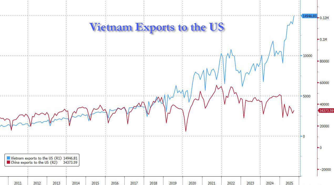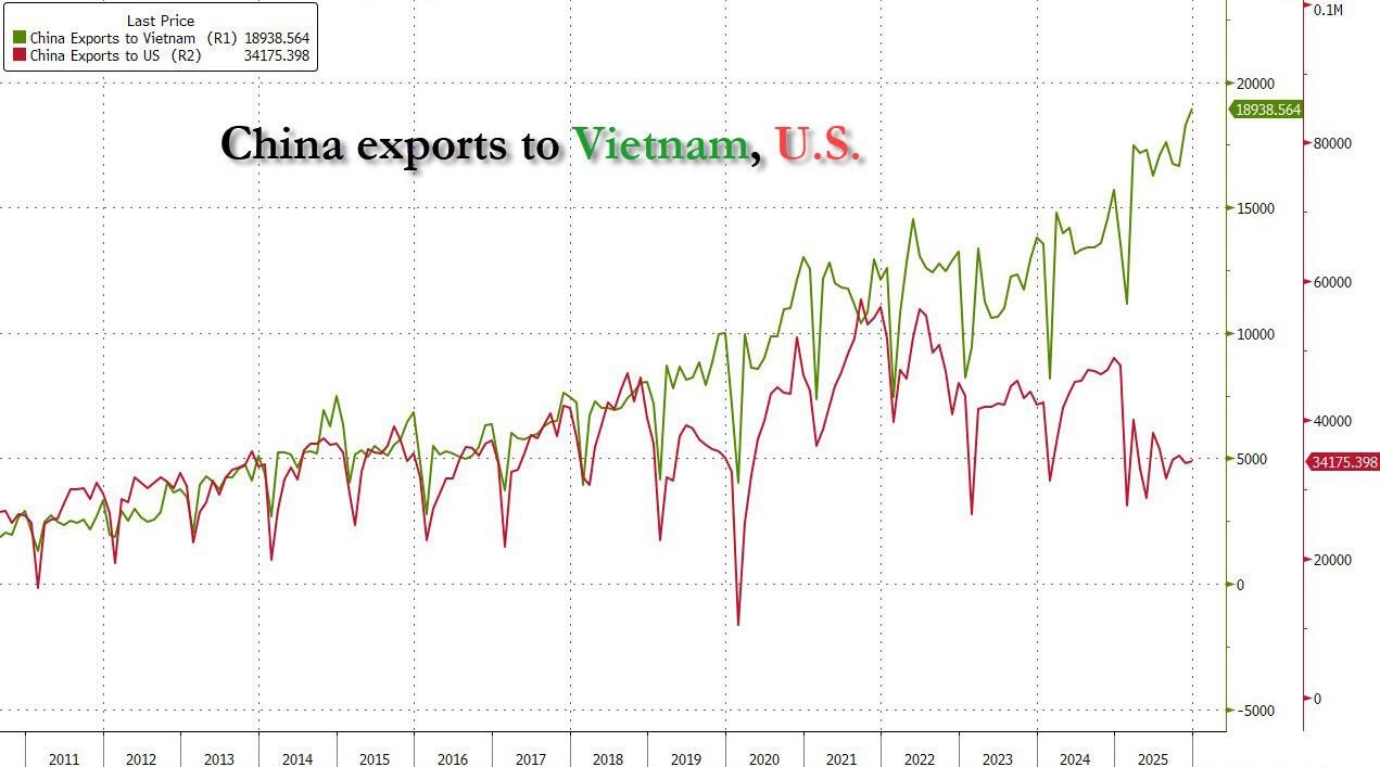 In a sign of the growing decoupling of direct trade between China and the US, the American share of Chinese exports last year was 11.1% , down from 14.7% in 2024, some of the lowest levels since the 1990s, the FT reports. Of course, that is woefully inaccurate at worse, and at best incomplete, since China has merely redirected its US goods via intermediary countries – i.e., transshipments – such as Vietnam, which has seen imports from China soar to a record high.