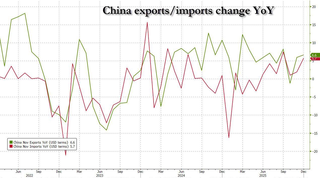 …  exports grew 6.6% YoY in dollar terms, more than double the average forecast from a Bloomberg poll of analysts of 3.1% and greater than November’s growth rate of 5.9%, while imports rose 5.7% in dollars last month on a year earlier, also far outpacing analyst expectations of 0.9% growth and the previous month’s figure of 1.9%.